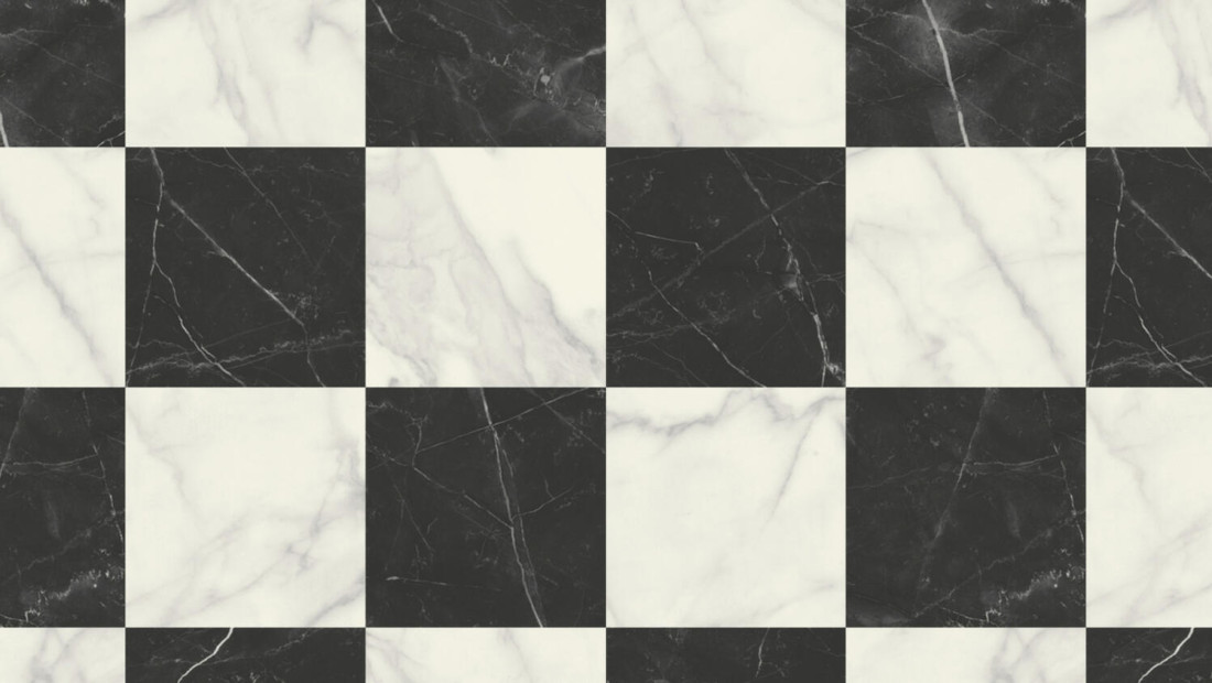 Elegante diseño de damero ajedrezado que se realza con un efecto mármol. Ideal para instalar en hogares y comercios gracias a su resistente capa de uso, y superficie con tratamiento Xtreme Protection.