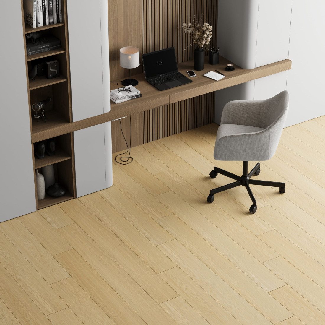 Estilo atemporal y resistencia superior. El suelo vinílico Roble Coimbra ofrece un tono marrón claro con vetas naturales, ideal para ambientes acogedores y elegantes. Un suelo SPC diseñado para durar.