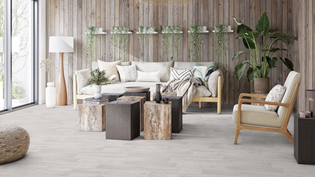 Suelo vinílico fabricado por Tarkett con apariencia de roble en tono gris perla. Superficie acabada con relieve realista, de tacto sedoso. Swan Pearl Grey evoca una elegancia serena y crea una sensación de calma y pureza con su aspecto pulcro y luminoso. El dibujo de las lamas presenta más de 15 cms de ancho. La suavidad de sus matices grises se fusiona con la luz, capaz de generar una atmósfera atractiva y sofisticada en cualquier espacio.